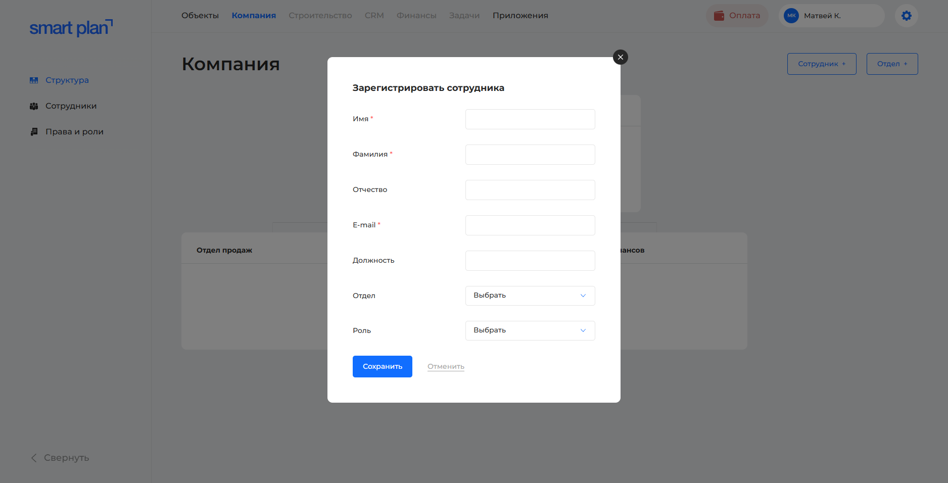 - Нажмите кнопку «Отдел» или «Сотрудник» в правом верхнем углу